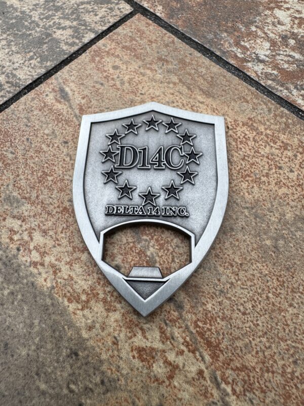This is the newly released Delta 14 challenge coin bottle opener. Metal gray and simple this offers a simple yet functional item. 1.75″ wide and 2.75″ long it is perfect for a key chain or man cave. As with all of our products if you break it, we replace it.